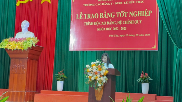 Thay mặt cho các tân cử nhân thực hành K1, em Bùi Thanh Phương đã bày tỏ tình cảm, lòng biết ơn sâu sắc đến các thầy cô: “Ngày hôm nay, khi cầm trên tay tấm bằng tốt nghiệp, chúng em cảm nhận rõ hơn giá trị của những năm tháng học tập và rèn luyện. Chúng em xin gửi lời cảm ơn chân thành đến Ban Giám hiệu, quý thầy cô đã tận tụy dạy dỗ, truyền đạt cho chúng em không chỉ kiến thức mà còn cả đạo đức và tình yêu với nghề. Dù sau này ở bất cứ nơi đâu, chúng em vẫn luôn tự hào khi được là sinh viên của Trường Cao đẳng Y – Dược Lê Hữu Trác – ngôi trường đã chắp cánh cho ước mơ của chúng em.”